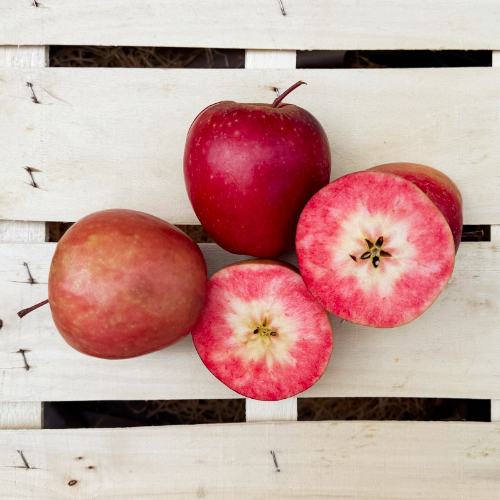 Kissabel-Äpfel zeichnen sich durch ihr rotes bis rosafarbenes Fruchtfleisch aus, das durch eine natürliche Kreuzung mit Wildäpfeln entstanden ist. Der Kissabel Apfel hat ein einzigartiges Aroma, das an Beeren erinnert, und sind voll von Antioxidantien, was sie besonders gesund macht.