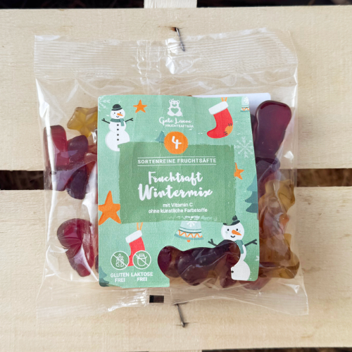 Seit September gibt es schon wieder Lebkuchen und Spekulatius in den Märkten. Falls Du daher Lust auf eine leckere Abwechslung hast, probiere unseren leckeren Fruchtsaft Wintermix. Denn auch für die Weihnachtszeit wollen wir Dir die leckeren Fruchtsaftbären nicht vorenthalten. Für winterliche Stimmung sorgen die schönen Weihnachtsformen, passend zur Adventszeit. Lass Dich von den leckeren sortenreichen Fruchtsaftbären überzeugen.