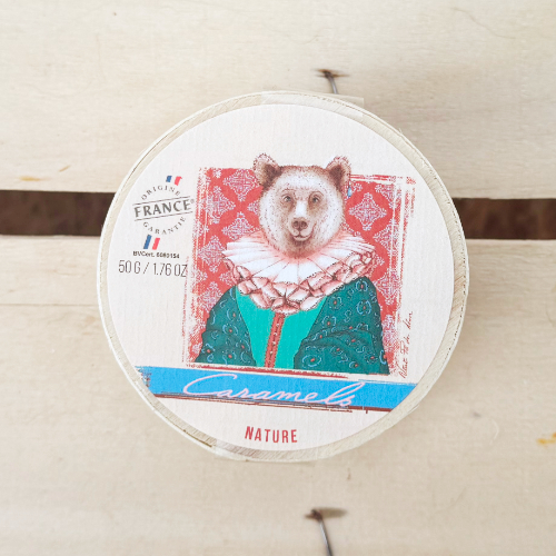 Kleine weiche Karamellbonbons mit feiner Butter aus dem Poitou Charentes, einzeln verpackt, in charmanter Spanholzschachtel mit Bärenmotiv.