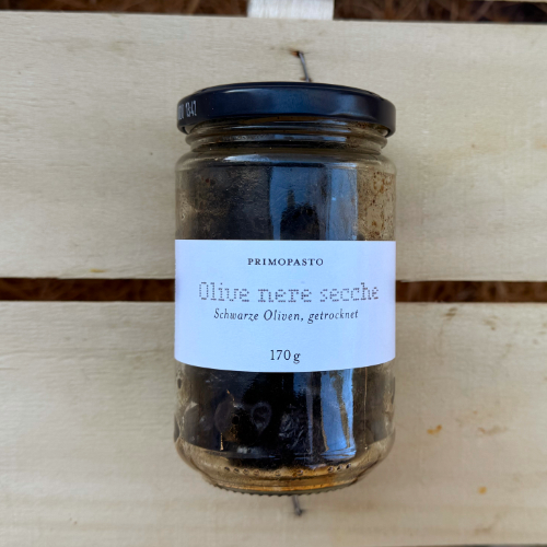 Schwarze, vollreife Oliven mit Kernen nach der facon grecque in Salz getrocknet. Sie besitzen einen konzentrierten, würzigen Geschmack. Auf Pizza, in Brot und zum Würzen von Tomatensaucen.